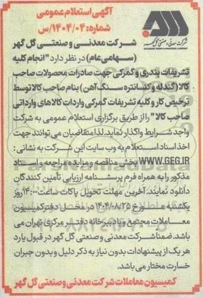 تلفن:5- 88349670 (021) فکس: 88349673 (021) Website: www.ParsNamadData.com E-mail: Info@ParsNamadData.com استعلام انجام کلیه تشریفات بندری و گمرکی جهت صادرات محصولات صاحب کالا (گندله و کنسانتره سنگ آهن)