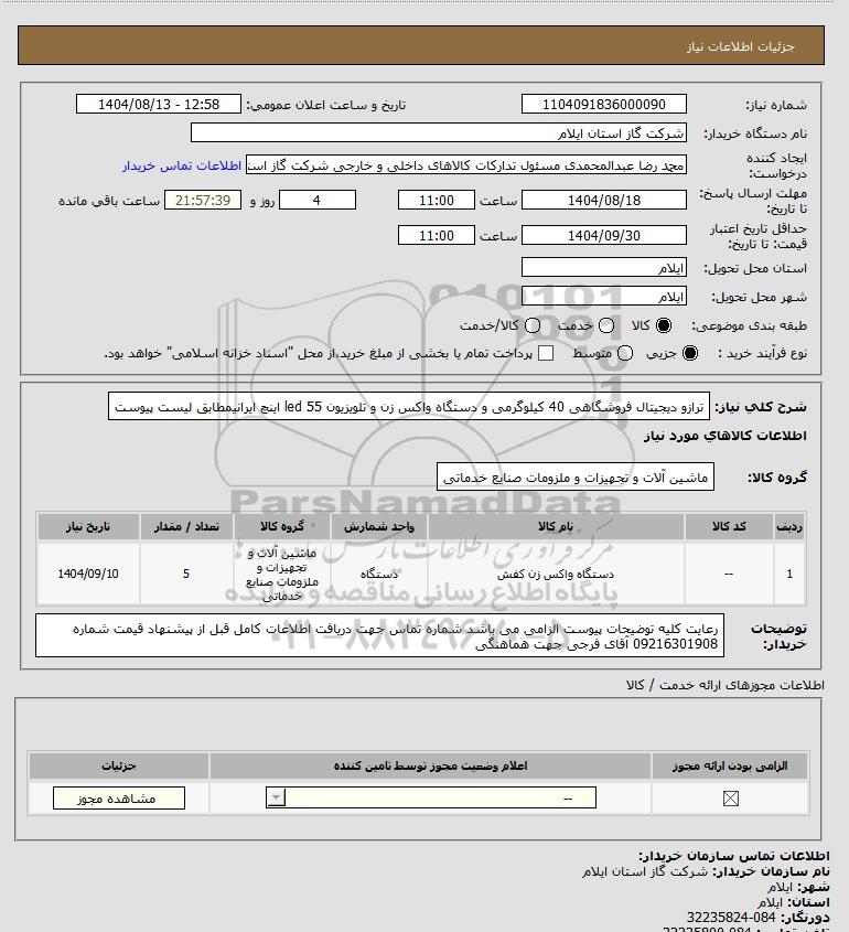 تلفن:5- 88349670 (021) فکس: 88349673 (021) Website: www.ParsNamadData.com E-mail: Info@ParsNamadData.com استعلام ترازو دیجیتال فروشگاهی 40 کیلوگرمی و دستگاه واکس زن و تلویزیون led 55 اینچ ایرانیمطابق لیست پیوست