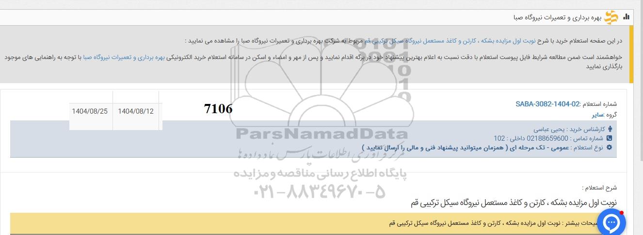 تلفن:5- 88349670 (021) فکس: 88349673 (021) Website: www.ParsNamadData.com E-mail: Info@ParsNamadData.com مزایده بشکه، کارتن و کاغذ مستعمل