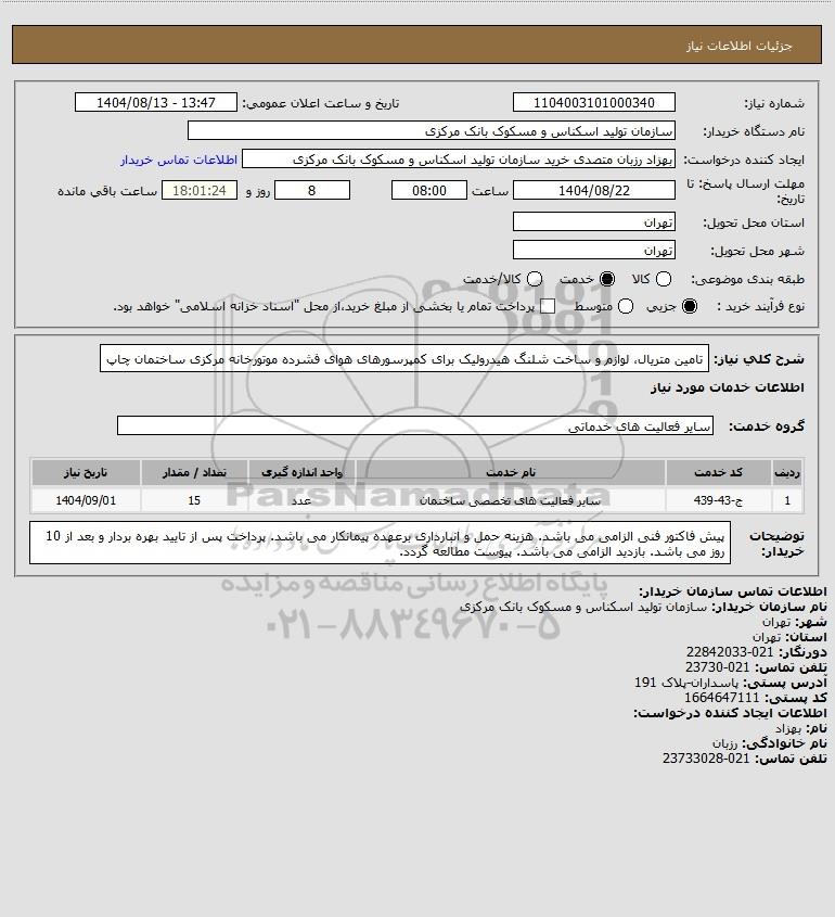 تلفن:5- 88349670 (021) فکس: 88349673 (021) Website: www.ParsNamadData.com E-mail: Info@ParsNamadData.com استعلام تامین متریال لوازم و ساخت شلنگ هیدرولیک برای کمپرسورهای هوای فشرده موتورخانه مرکزی ساختمان چاپ