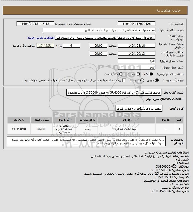 تلفن:5- 88349670 (021) فکس: 88349673 (021) Website: www.ParsNamadData.com E-mail: Info@ParsNamadData.com استعلام محیط کشت آگار آگار با کد کالا GRM666 به مقدار 30000 گرم
