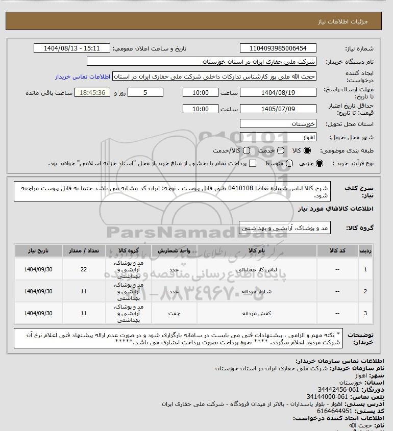 تلفن:5- 88349670 (021) فکس: 88349673 (021) Website: www.ParsNamadData.com E-mail: Info@ParsNamadData.com استعلام شرح کالا لباس شماره تقاضا 0410108 طبق فایل پیوست . توجه: ایران کد مشابه می باشد حتما به فایل پیوست مراجعه شود.