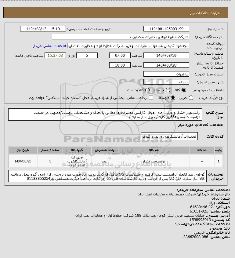 تلفن:5- 88349670 (021) فکس: 88349673 (021) Website: www.ParsNamadData.com E-mail: Info@ParsNamadData.com استعلام ترانسمیتر فشار و حرارت ضد انفجار گارانتی معتبر/دقیقا مطابق با تعداد و مشخصات پیوست/عضویت در avlنفت الزامیست/تسویه65روز کاری/تحویل انبار ساری/