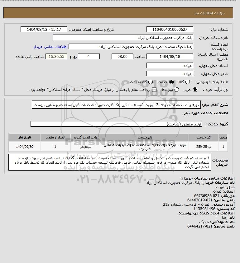 تلفن:5- 88349670 (021) فکس: 88349673 (021) Website: www.ParsNamadData.com E-mail: Info@ParsNamadData.com استعلام تهیه و نصب تعداد حدودی 13 یونیت قفسه سنگین راک فلزی طبق مشخصات فایل استعلام و تصاویر پیوست