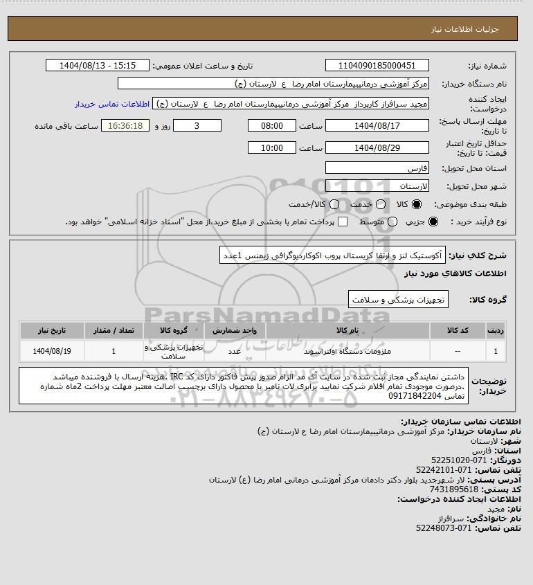 تلفن:5- 88349670 (021) فکس: 88349673 (021) Website: www.ParsNamadData.com E-mail: Info@ParsNamadData.com استعلام آکوستیک لنز و ارتقا کریستال پروب اکوکاردیوگرافی زیمنس 1عدد