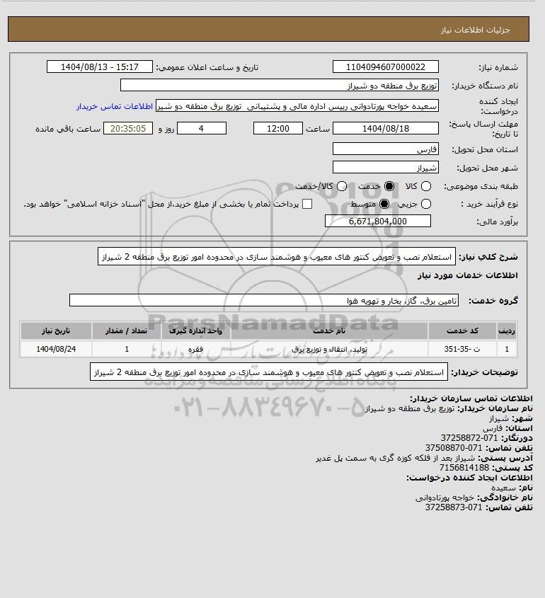 تلفن:5- 88349670 (021) فکس: 88349673 (021) Website: www.ParsNamadData.com E-mail: Info@ParsNamadData.com استعلام استعلام نصب و تعویض کنتور های معیوب و هوشمند سازی در محدوده امور توزیع برق منطقه 2 شیراز