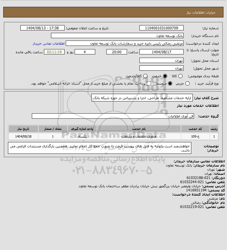 تلفن:5- 88349670 (021) فکس: 88349673 (021) Website: www.ParsNamadData.com E-mail: Info@ParsNamadData.com استعلام ارایه خدمات مشاوره طراحی اجرا و پشتیبانی در حوزه شبکه بانک