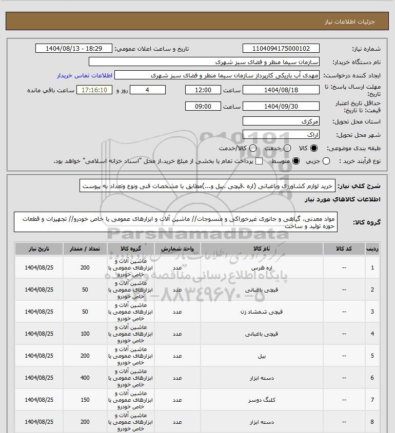 تلفن:5- 88349670 (021) فکس: 88349673 (021) Website: www.ParsNamadData.com E-mail: Info@ParsNamadData.com استعلام خرید لوازم کشاورزی وباغبانی (اره .قیچی .بیل و...)مطابق با مشخصات فنی ونوع وتعداد به پیوست