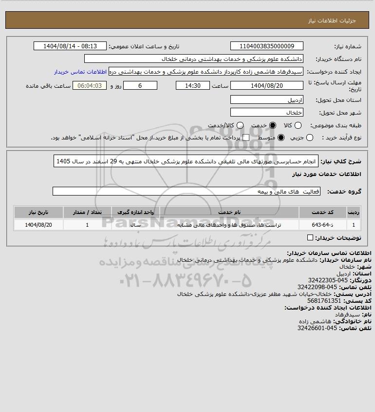 تلفن:5- 88349670 (021) فکس: 88349673 (021) Website: www.ParsNamadData.com E-mail: Info@ParsNamadData.com استعلام انجام حسابرسی صورتهای مالی تلفیقی دانشکده علوم پزشکی خلخال منتهی به 29 اسفند در سال 1405