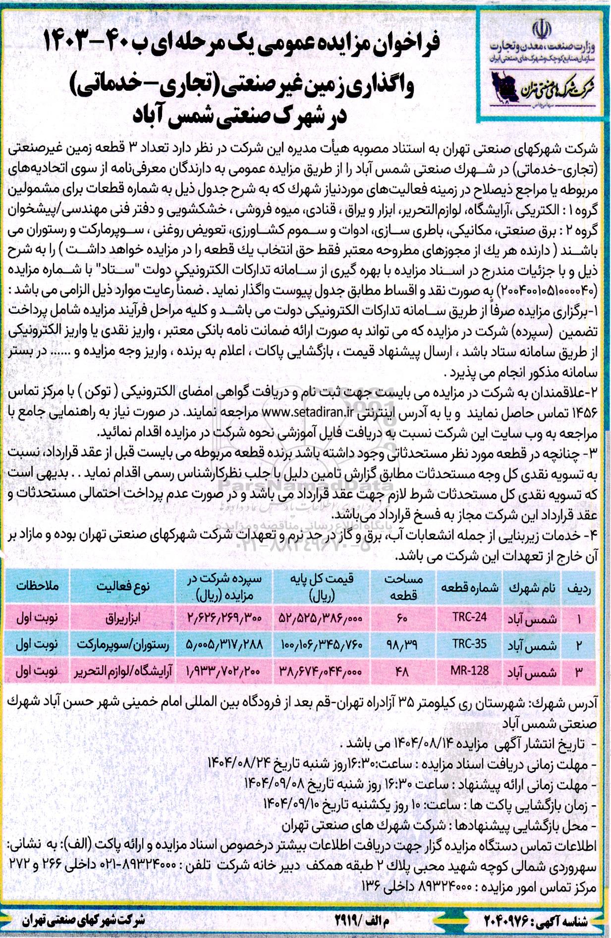 شرکت شهرکهای صنعتی تهران به استناد مصوبه هیأت مدیره این شرکت در نظر دارد تعداد 3 قطعه زمین غیر صنعتی (تجاری - خدماتی) در شهرک صنعتی شمس آباد را از طریق مزایده عمومی به دارندگان معرفی نامه از سوی اتحادیه های مربوطه با مراجع ذیصلاح در زمینه فعالیتهای مورد نیاز شهرک که به شرح جدول ذیل به شماره قطعات برای مشمولین