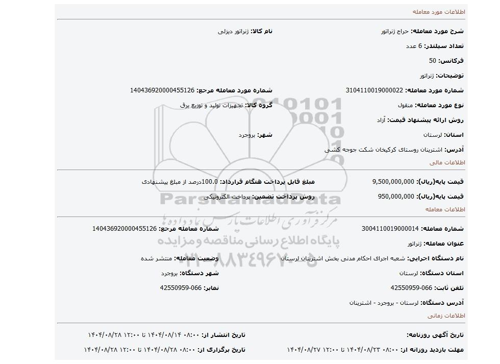 | قیمت پایه(ریال): 9,500,000,000 | | مبلغ قابل پرداخت هنگام قرارداد: 100.0درصد از مبلغ پیشنهادی | | قیمت پایه(ریال): 950,000,000 | | روش پرداخت تضمین: پرداخت الکترونیکی |