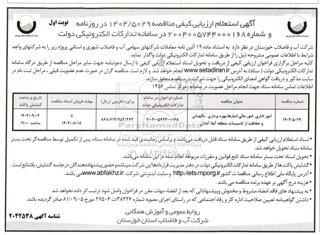 مناقصه امور اداری، امور مالی، انبارها،بهره برداری نگهبانی و حفاظت از تاسیسات منطقه آبفا