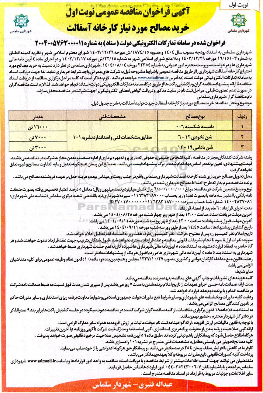 شهرداری سلماس به استناد بودجه مصوب سال 1404 و مصوبه 1874.15 ش مورخه 1403.12.26 شورای محترم اسلامی شهر و نظریه کمیته انطباق به شماره 16.15103 مورخه 1403.12.29 و بلا مانع شورای اسلامی شهر به شماره 22.15 ش مورخه 1404.12.17 و در اجرای ماده 4 آیین نامه مالی شهرداریها و درخواست سرپرست محترم امور عمرانی شهرداری سلماس در نظر دارد نسبت به خرید مصالح موردنیاز کارخانه آسفالت شهرداری را از طریق مناقصه عمومی با شرایط مشروحه ذیل از اشخاص واجد شرایط خریداری نماید. لذا جهت دریافت اسناد به سامانه تدارکات الکترونیکی دولت ستاد به آدرس ستاد ایران مراجعه فرمائید. لازم به ذکر است که کلیه مراحل برگزاری مناقصه از دریافت اسناد مناقصه تا ارائه پیشنهاد مناقصه گران و بازگشایی پاکتها و عقد قرارداد از طریق درگاه سامانه تدارکات الکترونیکی دولت (ستاد) انجام خواهد شد. لذا لازم است مناقصه گران در صورت عدم عضویت قبلی مراحل ثبت نام در سایت مذکور و دریافت گواهی امضای الکترونیکی را جهت شرکت در مناقصه محقق سازند.
