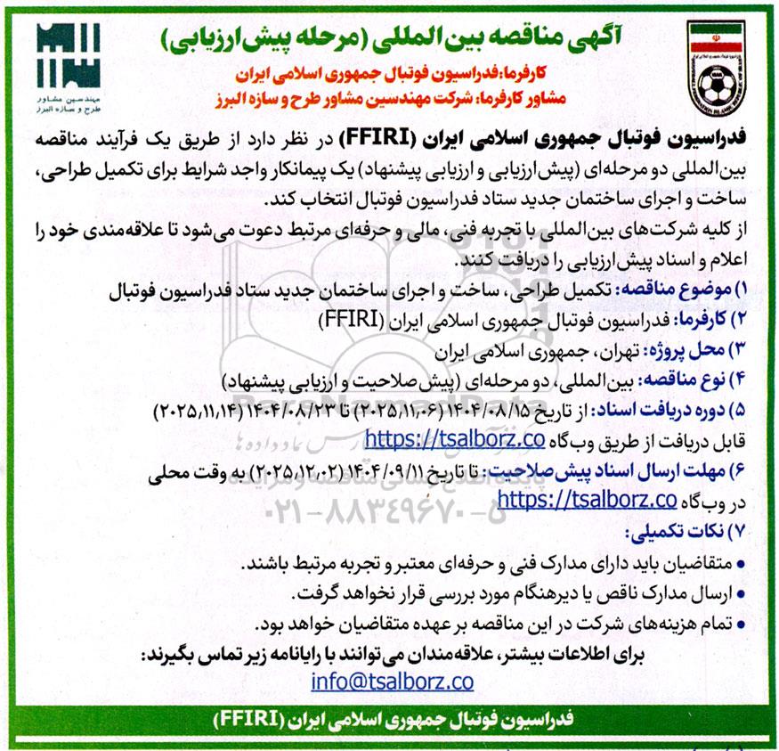 فدراسیون فوتبال جمهوری اسلامی ایران (FFIRI) در نظر دارد از طریق یک فرآیند مناقصه بین المللی دو مرحله ای (پیش ارزیابی و ارزیابی پیشنهاد) یک پیمانکار واجد شرایط برای تکمیل طراحی، ساخت و اجرای ساختمان جدید ستاد فدراسیون فوتبال انتخاب کند.