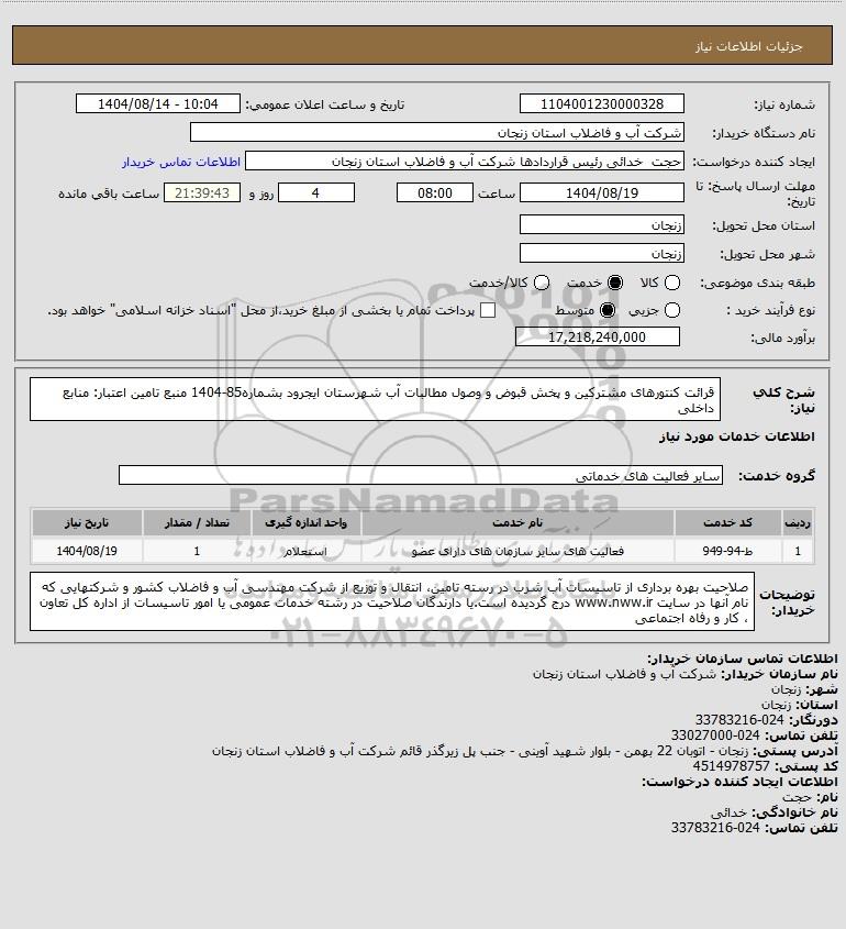 تلفن:5- 88349670 (021) فکس: 88349673 (021) Website: www.ParsNamadData.com E-mail: Info@ParsNamadData.com استعلام قرائت کنتورهای مشترکین و پخش قبوض و وصول مطالبات آب شهرستان ایجرود بشماره85-1404