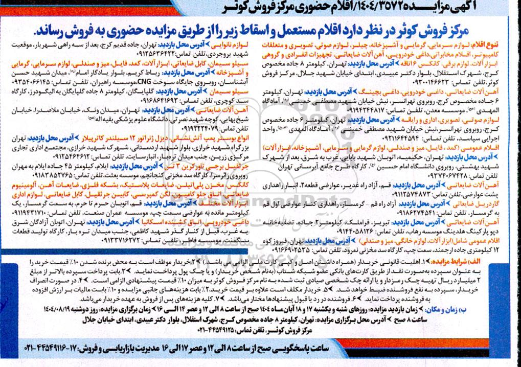 اگهی مزایده 1404.3572. اقلام حضوری مرکز فروش کوتر