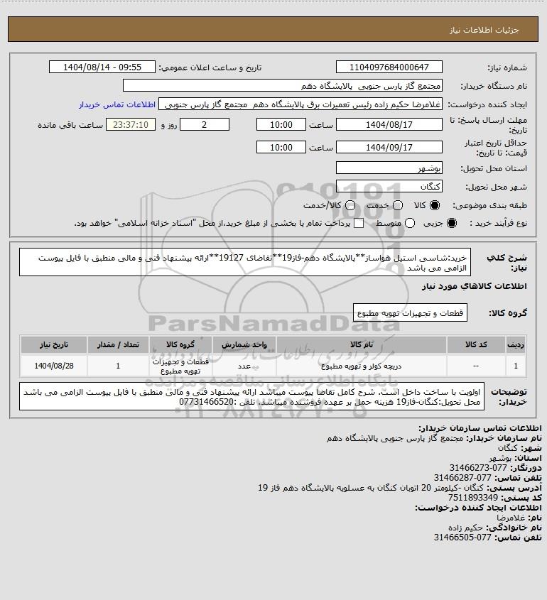 تلفن:5- 88349670 (021) فکس: 88349673 (021) Website: www.ParsNamadData.com E-mail: Info@ParsNamadData.com استعلام خرید:شاسی استیل هواساز**پالایشگاه دهم-فاز19**تقاضای 19127**ارائه پیشنهاد فنی و مالی منطبق با فایل پیوست الزامی می باشد