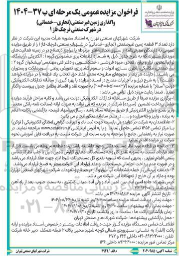 شرکت شهرکهای صنعتی تهران به استناد مصوبه هیأت مدیره این شرکت در نظر دارد تعداد 3 قطعه زمین غیر صنعتی (تجاری - خدماتی) در شهرک صنعتی قرچک فاز 1 را از طریق مزایده عمومی به دارندگان معرفی نامه از سوی اتحادیه های مربوطه با مراجع ذیصلاح در زمینه فعالیتهای مورد نیاز شهرک که به شرح جدول ذیل به شماره قطعات برای مشمولین
