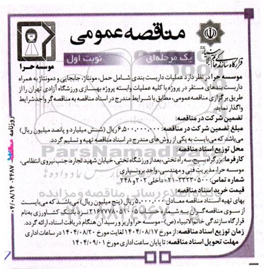 موسسه حرا در نظر دارد عملیات داربست بندی شامل حمل، مونتاژ، جابجایی و دمونتاژ به همراه داربست بندهای مستقر در پروژه با کلیه عملیات وابسته پروژه بهسازی ورزشگاه آزادی تهران را از طریق برگزاری مناقصهعمومی، مطابق با شرایط مندرج در اسناد مناقصه به مناقصه گر واجدشرایط واگذار نماید.