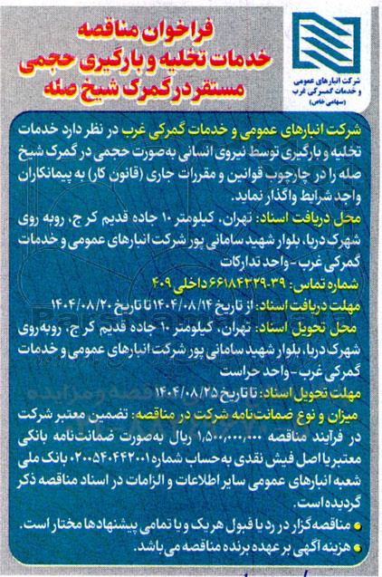 شرکت انبارهای عمومی و خدمات گمرکی غرب در نظر دارد خدمات تخلیه و بارگیری توسط نیروی انسانی به صورت حجمی در گمرک شیخ صله را در چارچوب قوانین و مقررات جاری قانون کار به پیمانکاران واجد شرایط واگذار نماید.