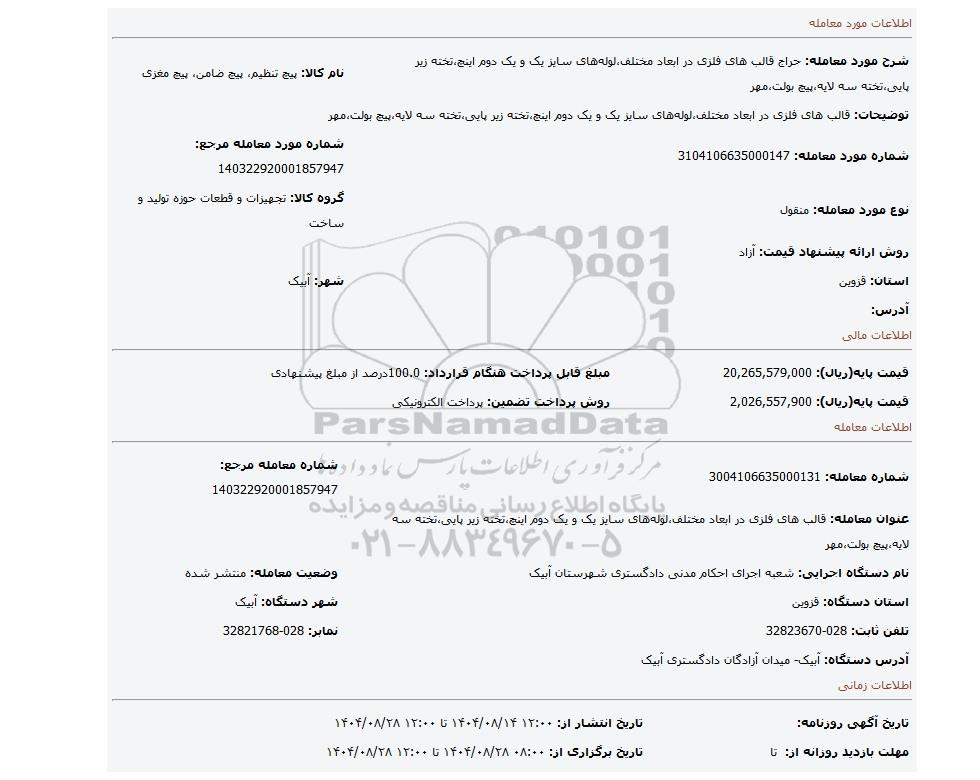 | عنوان آگهی: مزایده قالب های فلزی در ابعاد مختلفلوله های سایز یک و یک دوم اینچتخته زیر پاییتخته سه لایهپیچ بولتمهر |
