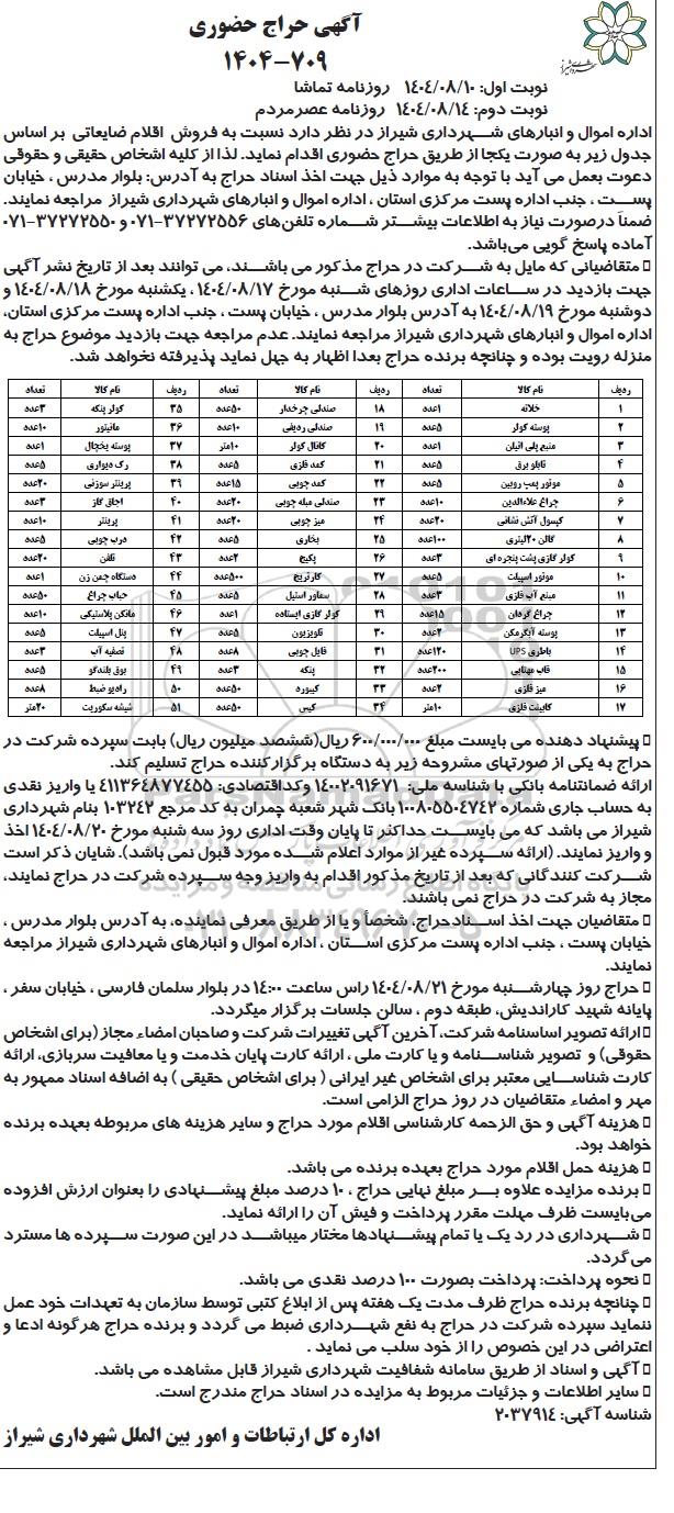 اداره اموال و انبارهای شهرداری شیراز در نظر دارد نسبت به فروش اقلام ضایعاتی بر اساس جدول زیر به صورت یکجا از طریق حراج حضوری اقدام نماید. لذا از کلیه اشخاص حقیقی و حقوقی دعوت بعمل می آید با توجه به موارد ذیل جهت اخذ اسناد حراج به آدرس بلوار مدرس ، خیابان پست ، جنب اداره پست مرکزی استان، اداره اموال و انبارهای شهرداری شیراز مراجعه نمایند. ضمنا در صورت نیاز به اطلاعات بیشتر شماره تلفنهای 37272556 -071 و 37272550 -071 آماده پاسخ گویی میباشد.