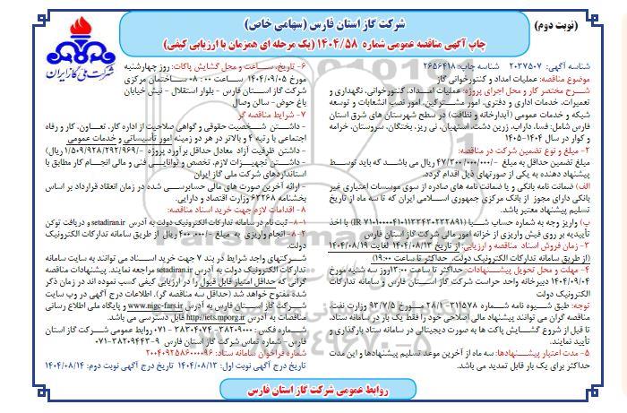 چاپ آگهی مناقصه عمومی شماره 1404/58 (یک مرحله ای همزمان با ارزیابی کیفی) نوبت دوم