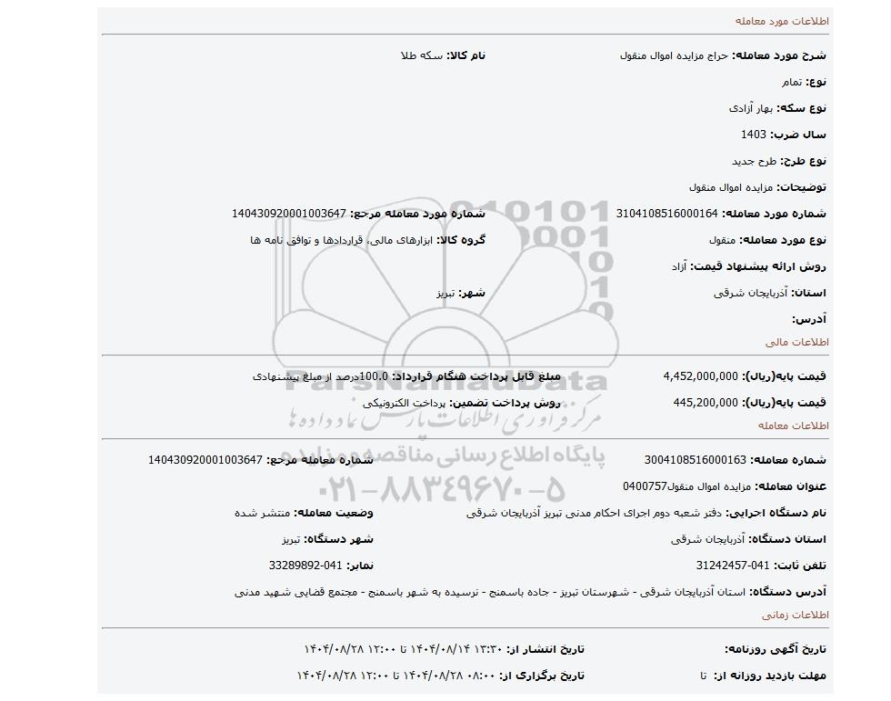 | شرح مورد معامله: حراج مزایده اموال منقول | | نام کالا: سکه طلا | | نوع: تمام | | نوع سکه: بهار آزادی | | سال ضرب: 1403 | | نوع طرح: طرح جدید | | توضیحات: مزایده اموال منقول | | شماره مورد معامله: 3104108516000164 | | شماره مورد معامله مرجع: 140430920001003647 | | نوع مورد معامله: منقول | | گروه کالا: ابزارهای مالی، قراردادها و توافق نامه ها | | روش ارائه پیشنهاد قیمت: آزاد