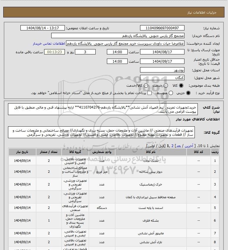 تلفن:5- 88349670 (021) فکس: 88349673 (021) Website: www.ParsNamadData.com E-mail: Info@ParsNamadData.com استعلام خرید:تجهیزات تمرینی تیم المپیاد آتش نشانی**پالایشگاه یازدهم-4110704276** ارایه پیشنهاد فنی و مالی منطبق با فایل پیوست الزامی می باشد.