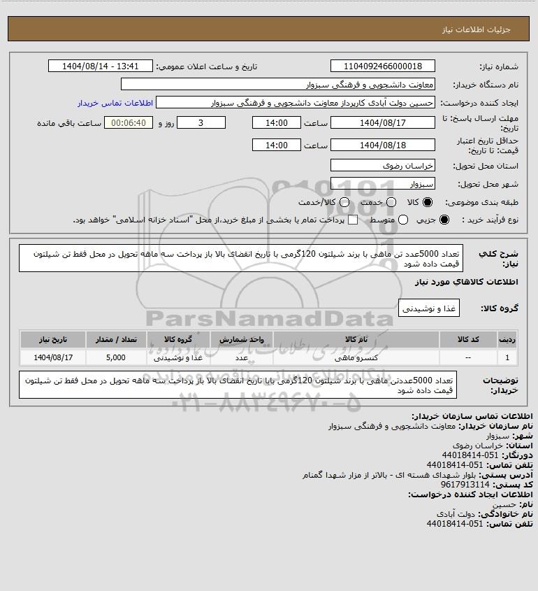 تلفن:5- 88349670 (021) فکس: 88349673 (021) Website: www.ParsNamadData.com E-mail: Info@ParsNamadData.com استعلام تعداد 5000عدد تن ماهی با برند شیلتون 120گرمی با تاریخ انقضای بالا باز پرداخت سه ماهه تحویل در محل فقط تن شیلتون قیمت داده شود