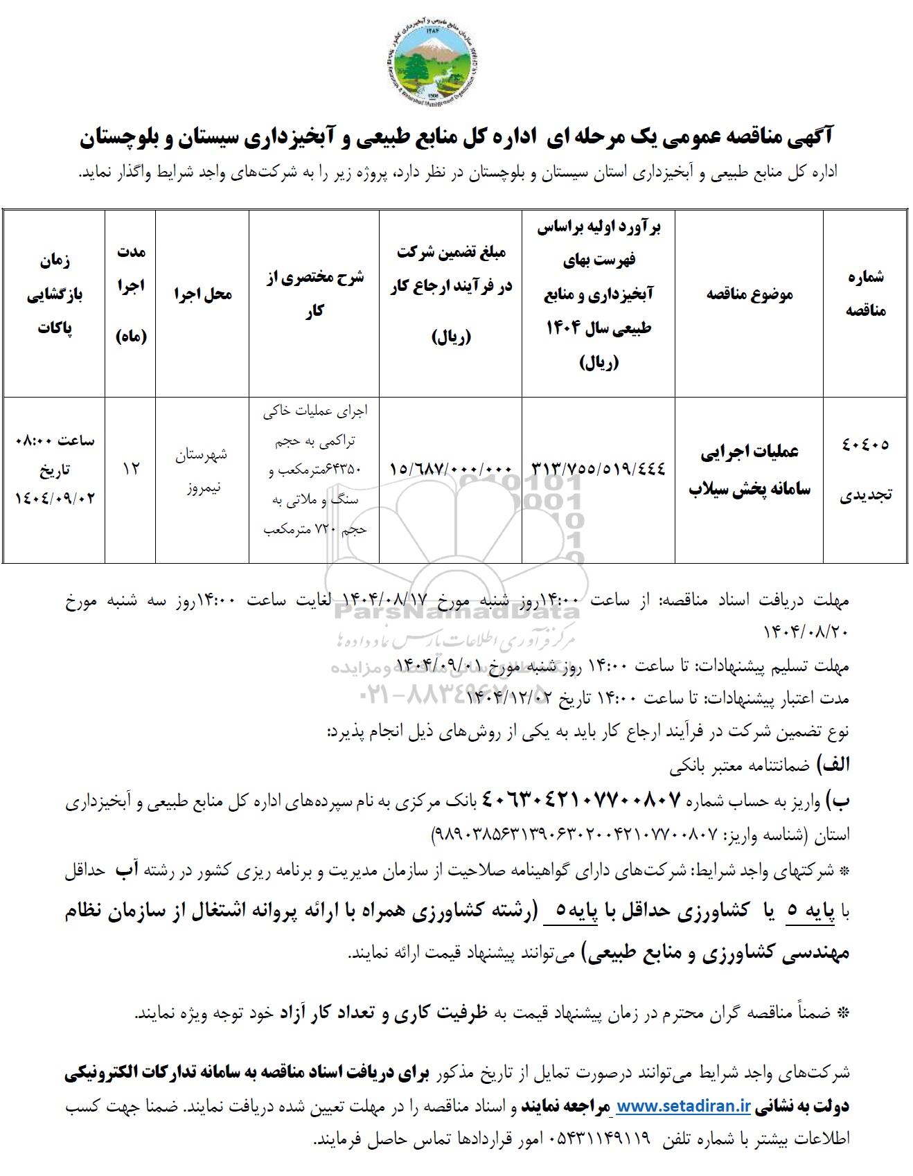 مناقصه عملیات اجرایی سامانه پخش سیلاب