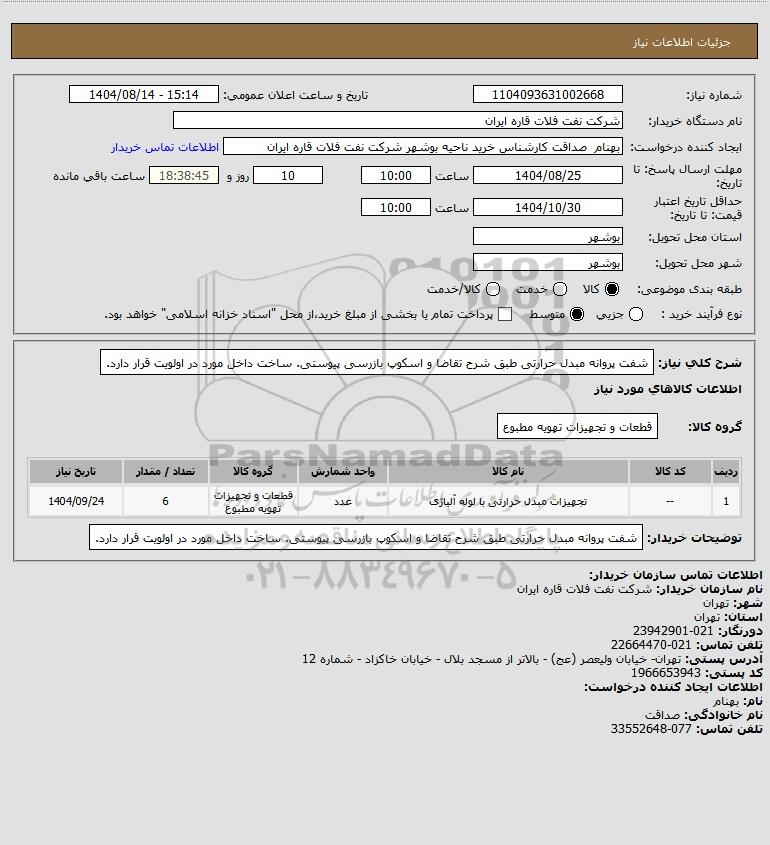 تلفن:5- 88349670 (021) فکس: 88349673 (021) Website: www.ParsNamadData.com E-mail: Info@ParsNamadData.com استعلام شفت پروانه مبدل حرارتی طبق شرح تقاضا و اسکوپ بازرسی پیوستی. ساخت داخل مورد در اولویت قرار دارد.