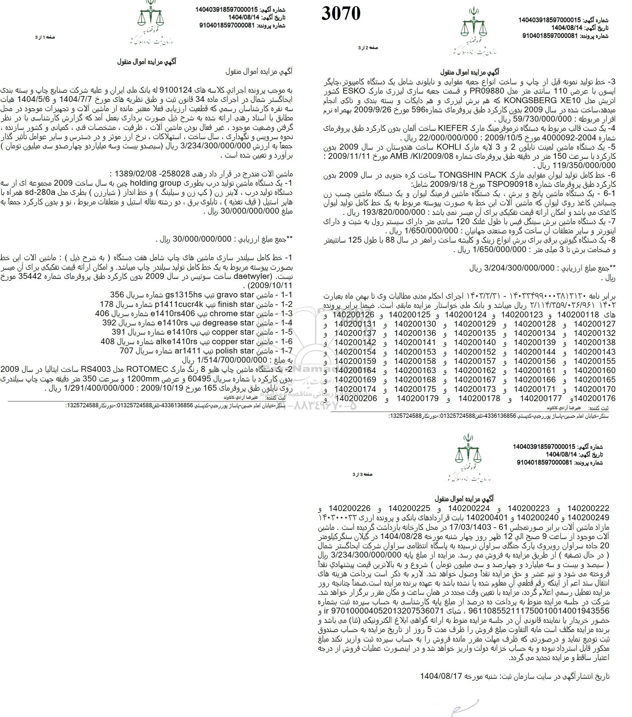 تلفن:5- 88349670 (021) فکس: 88349673 (021) Website: www.ParsNamadData.com E-mail: Info@ParsNamadData.com مزایده فروش ماشین آلات...