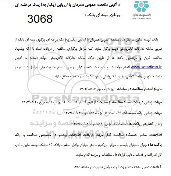 بانک توسعه تعاون در نظر دارد مناقصه عمومی همزمان با ارزیابی (یکپارچه) یک مرحله ای پرتفوی بیمه ای بانک را از طریق سامانه تدارکات الکترونیکی دولت برگزار نماید. کلیه مراحل برگزاری مناقصه از دریافت اسناد تا ارائه پیشنهاد مناقصه گران و بازگشایی پاکتها از طریق درگاه سامانه تدارکات الکترونیکی دولت (ستاد) انجام خواهد شد و لازم است مناقصه گران در صورت عدم عضویت قبلی، مراحل ثبت نام در سایت مذکور و دریافت گواهی امضای الکترونیکی را جهت شرکت در مناقصه محقق سازند.
