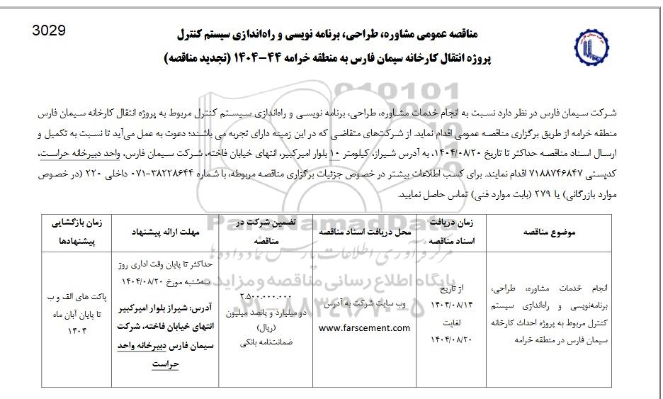 تلفن:5- 88349670 (021) فکس: 88349673 (021) Website: www.ParsNamadData.com E-mail: Info@ParsNamadData.com تجدید مناقصه مشاوره،طراحی،برنامه نویسی و راه اندازی سیستم کنترل