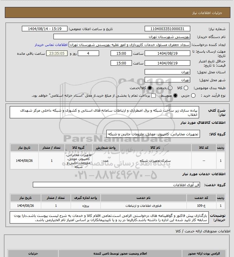 تلفن:5- 88349670 (021) فکس: 88349673 (021) Website: www.ParsNamadData.com E-mail: Info@ParsNamadData.com استعلام پیاده سازی زیر ساخت شبکه و برق اضطراری و ارتباطات سامانه های استانی و کشوری و شبکه داخلی مرکز شهدای انقلاب