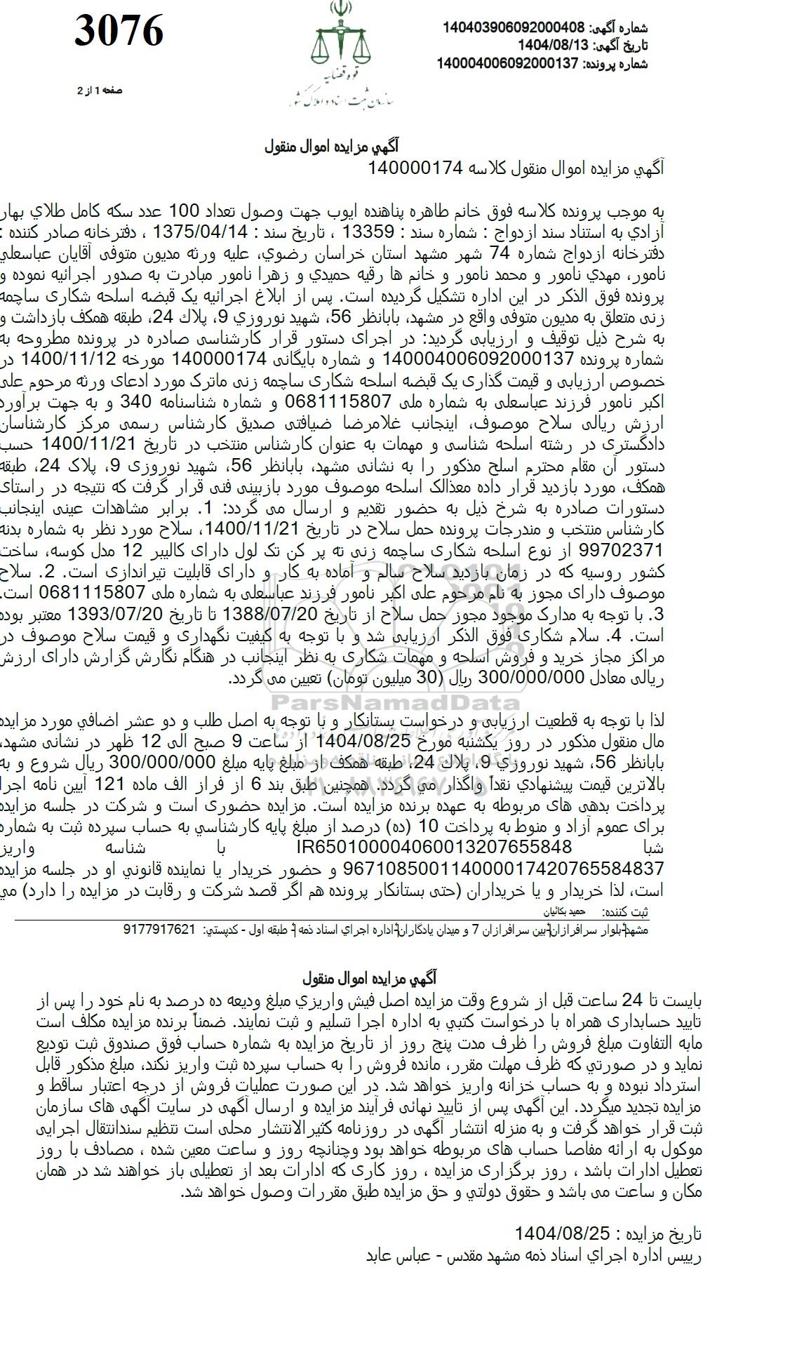 لذا با توجه به قطعیت ارزیابی و درخواست بستانکار و با توجه به اصل طلب و دو عشر اضافی مورد مزایده مال منقول مذکور در روز یکشنبه مورخ 1404.08.25 از ساعت 9 صبح الی 12 ظهر در نشانی مشهد با با نظر 56 شهید نوروزی 9 پلاک 24 طبقه همکف از مبلغ پایه مبلغ 300.000.000 ریال شروع و به بالاترین قیمت پیشنهادی نقدا واگذار می گردد. همچنین طبق بند 6 از فراز الف ماده 121 آیین نامه اجرا پرداخت بدهی های مربوطه به عهده برنده مزایده است. مزایده حضوری است و شرکت در جلسه مزایده برای عموم آزاد و منوط به پرداخت 10 (ده) درصد از مبلغ پایه کارشناسی به حساب سپرده ثبت به شماره شیا IR650100004060013207655848 し با شناسه واریز 967108500114000017420765584837 و حضور خریدار با نماینده قانونی او در جلسه مزایده است. لذا خریدار و یا خریداران حتی بستانکار پرونده هم اگر قصد شرکت و رقابت در مزایده را دارد می بایست تا 24 ساعت قبل از شروع وقت مزایده اصل فیش واریزی مبلغ ودیعه ده درصد به نام خود را پس از تایید حسابداری همراه با درخواست کتبی به اداره اجرا تسلیم و ثبت نمایند. ضمنا برنده مزایده مکلف است مابه التفاوت مبلغ فروش را ظرف مدت پنج روز از تاریخ مزایده به شماره حساب فوق صندوق ثبت تودیع نماید و در صورتی که ظرف مهلت مقرر مانده فروش را به حساب سپرده ثبت واریز نکند. مبلغ مذکور قابل استرداد نبوده و به حساب خزانه واریز خواهد شد. در این صورت عملیات فروش از درجه اعتبار ساقط و مزایده تجدید میگردد. این آگهی پس از تایید نهایی فرآیند مزایده و ارسال آگهی در سایت آگهی های سازمان ثبت قرار خواهد گرفت و به منزله انتشار آگهی در روزنامه کثیر الانتشار محلی است تنظیم سند انتقال اجرایی موکول به ارائه مفاصا حساب های مربوطه خواهد بود و چنانچه روز و ساعت معین شده ، مصادف با روز تعطیل ادارات باشد، روز برگزاری مزایده، روز کاری که ادارات بعد از تعطیلی باز خواهند شد در همان مکان و ساعت می باشد و حقوق دولتی و حق مزایده طبق مقررات وصول خواهد شد.