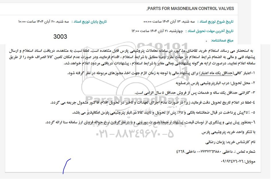 | عنوان آگهی: استعلام PARTS FOR MASONEILAN CONTROL VALVES |
