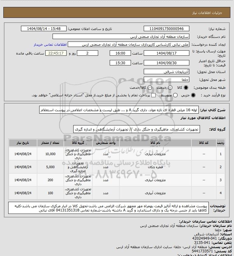 تلفن:5- 88349670 (021) فکس: 88349673 (021) Website: www.ParsNamadData.com E-mail: Info@ParsNamadData.com استعلام لوله 16 میلی قطره ای تازه مواد داری گرید A و ... طبق لیست و مشخصات اعلامی در پیوست استعلام