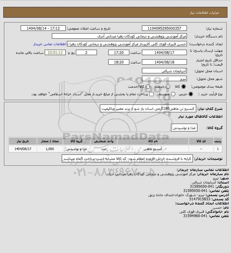 تلفن:5- 88349670 (021) فکس: 88349673 (021) Website: www.ParsNamadData.com E-mail: Info@ParsNamadData.com استعلام کنسرو تن ماهی180گرمی اسان باز شو از برند معتبر وباکیفیت