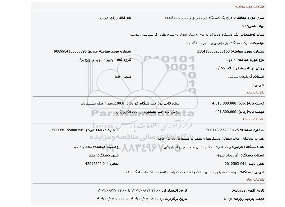 | عنوان آگهی: مزایده یک دستگاه دیزل ژنراتور و سایر دستگاهها |