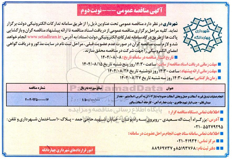 | عنوان آگهی: مناقصه انجام عملیات تبدیل قیر به آسفالت و حمل و پخش آسفالت ....- نوبت دوم |