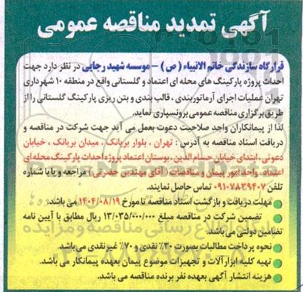 قرارگاه سازندگی خاتم الانبیاء (ص) - موسسه شهید رجایی در نظر دارد جهت احداث پروژه پارکینگ های محله ای اعتماد و گلستانی واقع در منطقه 10 شهرداری تهران عملیات اجرای آرماتوربندی، قالب بندی و بتن ریزی پارکینگ گلستانی را از طریق برگزاری مناقصه عمومی برونسپاری نماید.