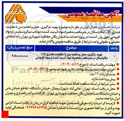 شرکت راهسازی و عمران ایران در نظر دارد موضوع تهیه، بارگیری، حمل و تخلیه بتن با مقاومت فشاری C35 مگاپاسکال در مترمکعب به همراه مواد آب بند کننده (دوغاب میکروسیلیس) و مواد افزودنی (فوق روان کننده) در پروژه احداث ساختمان یگان حفاظت شهرداری تهران را به اشخاص حقیقی و حقوقی واجد شرایط از طریق مناقصه عمومی واگذار نماید.