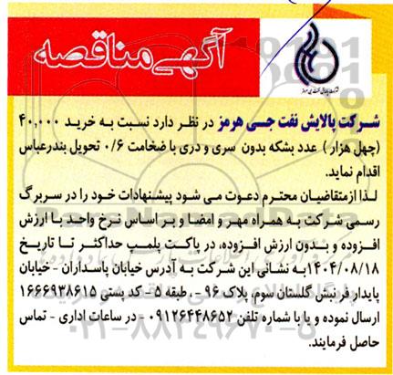 تلفن:5- 88349670 (021) فکس: 88349673 (021) Website: www.ParsNamadData.com E-mail: Info@ParsNamadData.com مناقصه خرید 40.000 (چهل هزار) عدد بشکه بدون سری و دری با ضخامت 0.6 ...