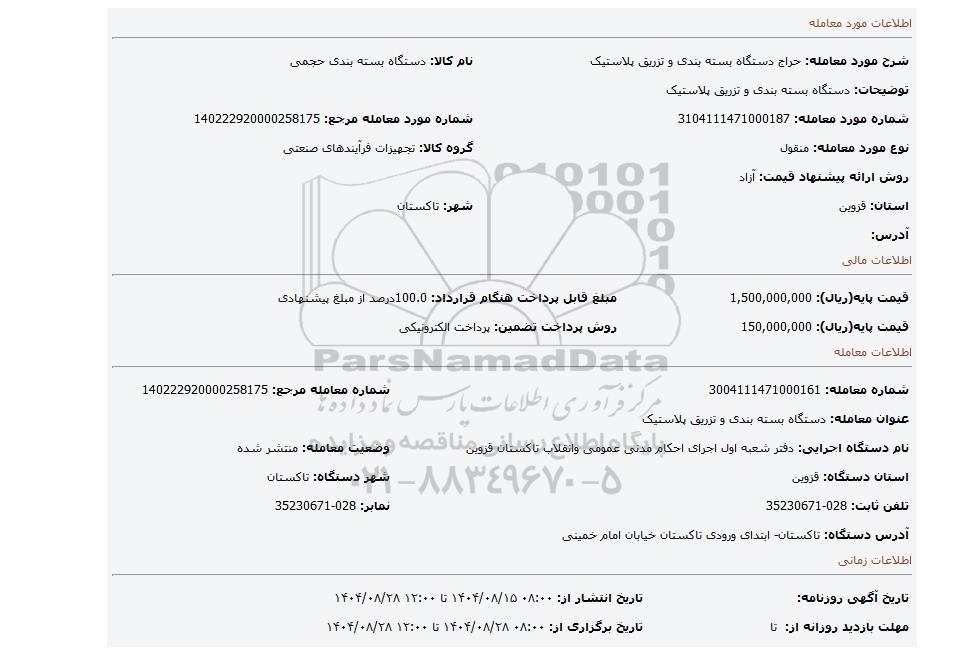 | عنوان آگهی: مزایده دستگاه بسته بندی و تزریق پلاستیک |