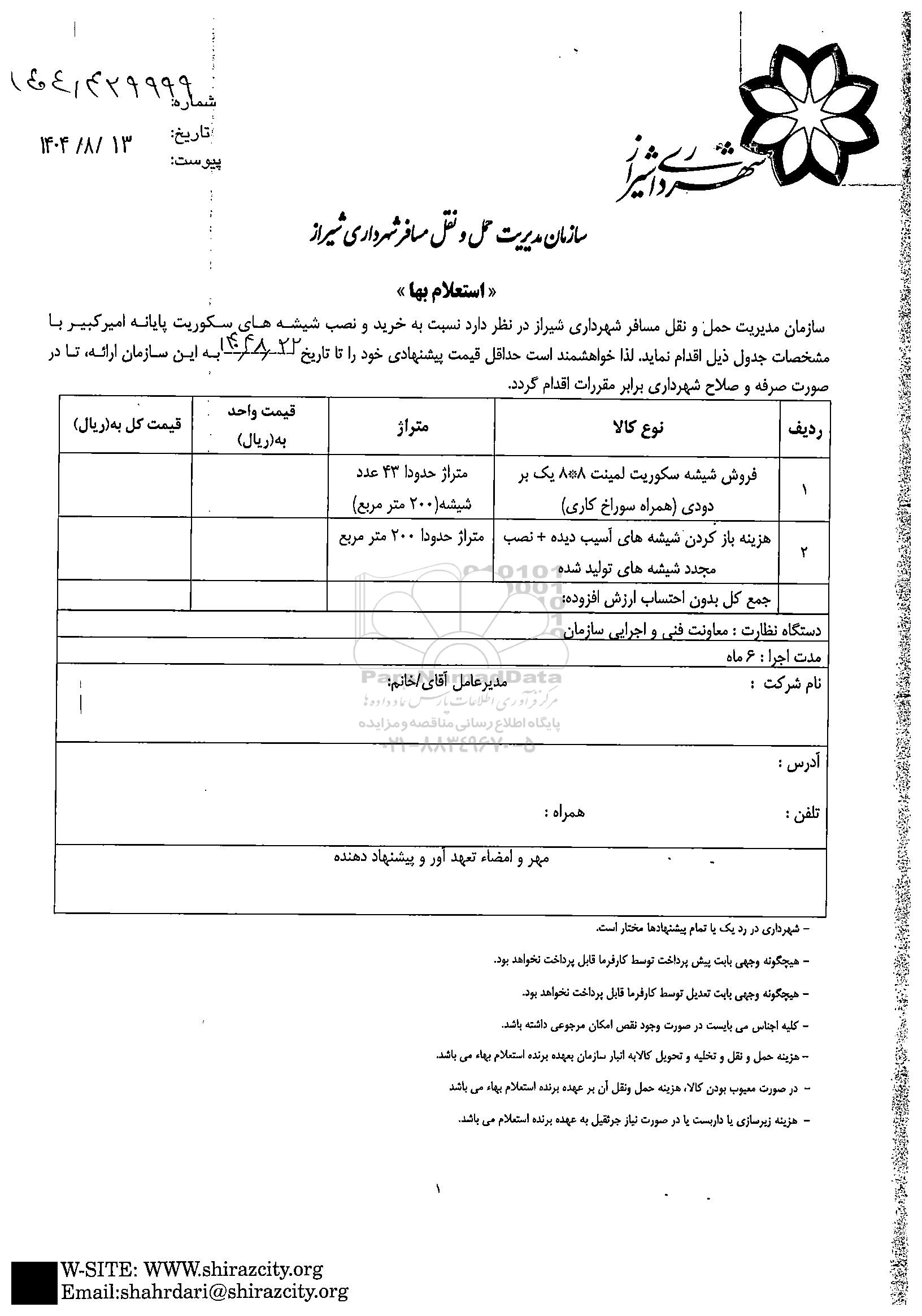 سازمان مدیریت حمل و نقل مسافر شهرداری شیراز در نظر دارد نسبت به خرید و نصب شیشه های سکوریت پایانه امیرکبیر با مشخصات جدول ذیل اقدام نماید. لذا خواهشمند است حداقل قیمت پیشنهادی خود را تا تاریخ 1404.08.22 را به این سازمان ارائه، تا در صورت صرفه و صلاح شهرداری برابر مقررات اقدام گردد.