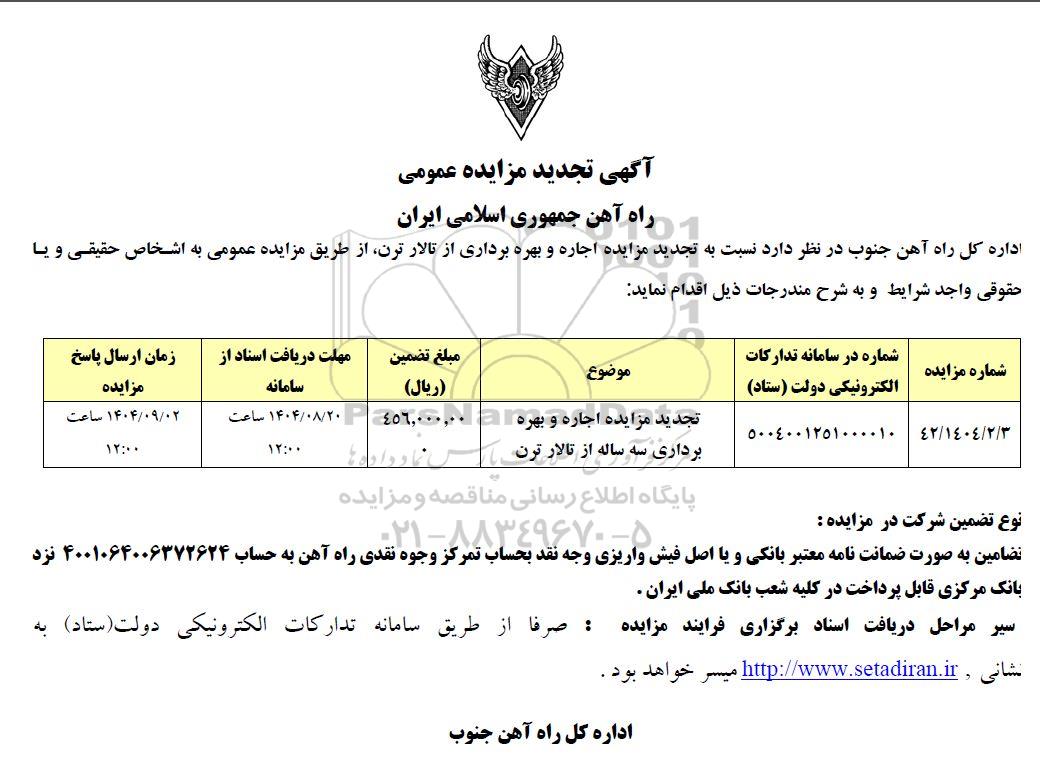اداره کل راه آهن جنوب در نظر دارد نسبت به تجدید مزایده اجاره و بهره برداری از تالار ترن از طریق مزایده عمومی به اشخاص حقیقی یا حقوقی واجد شرایط و به شرح مندرجات ذیل اقدام نماید: