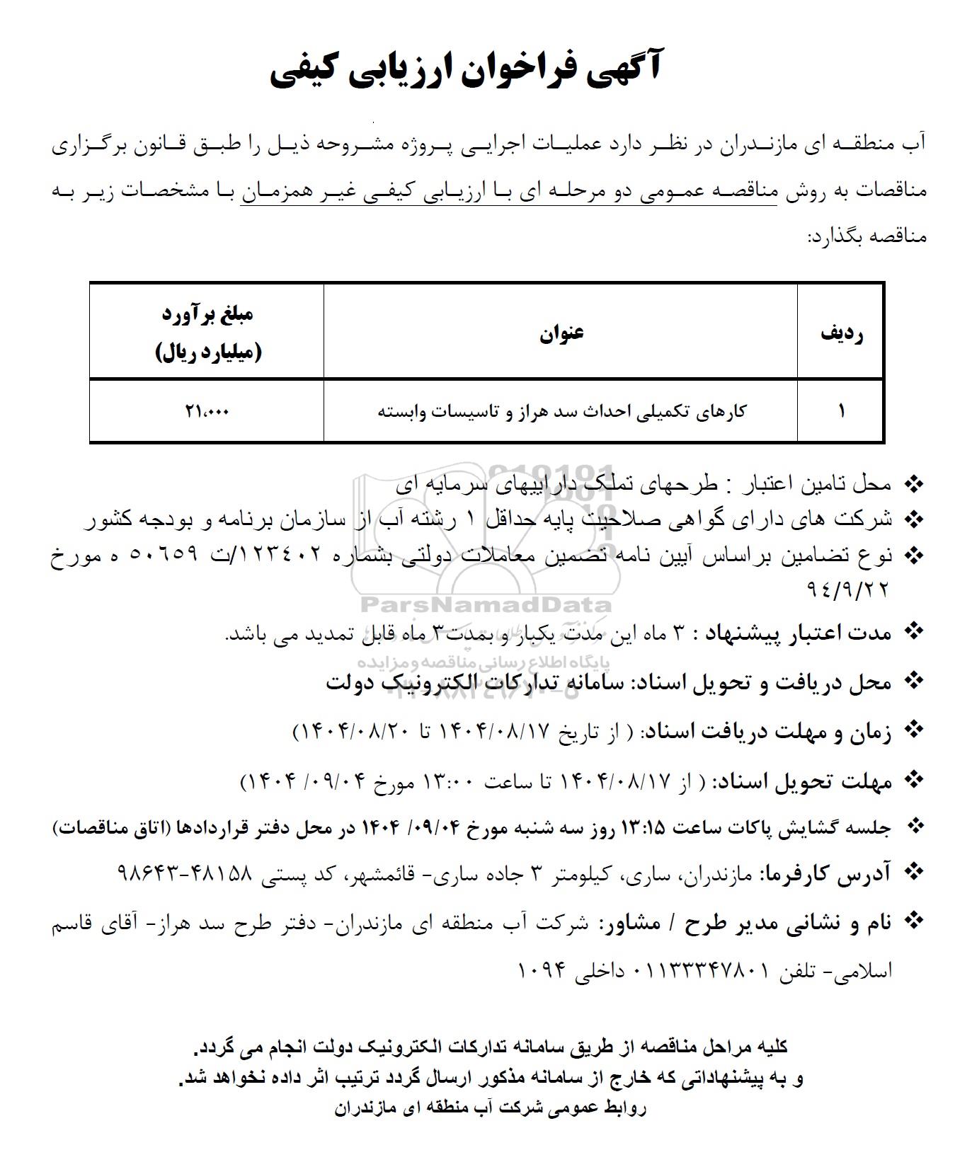 | عنوان آگهی: فراخوان ارزیابی کیفی کارهای تکمیلی احداث سد ... |