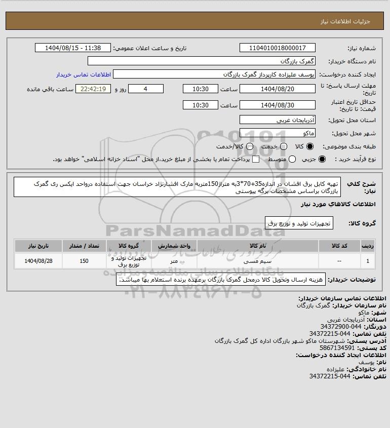 تلفن:5- 88349670 (021) فکس: 88349673 (021) Website: www.ParsNamadData.com E-mail: Info@ParsNamadData.com استعلام تهیه کابل برق افشان در اندازه35+70*3به متراژ150متربه مارک افشارنژاد خراسان جهت استفاده درواحد ایکس ری گمرک بازرگان براساس مشخصات برگه پیوستی